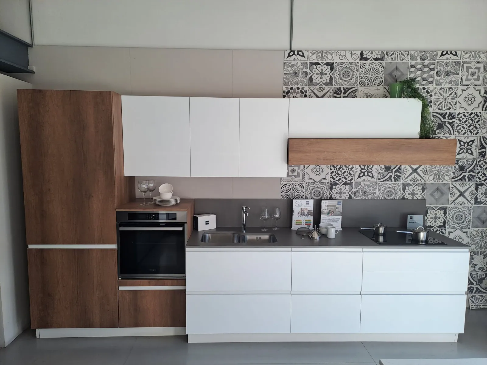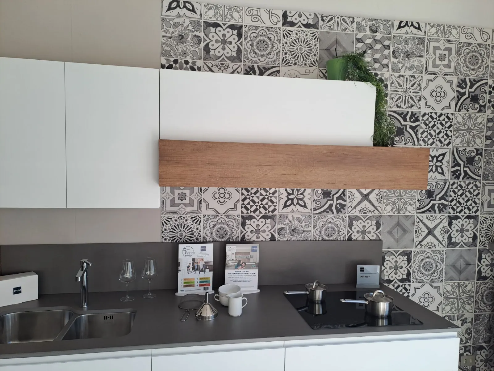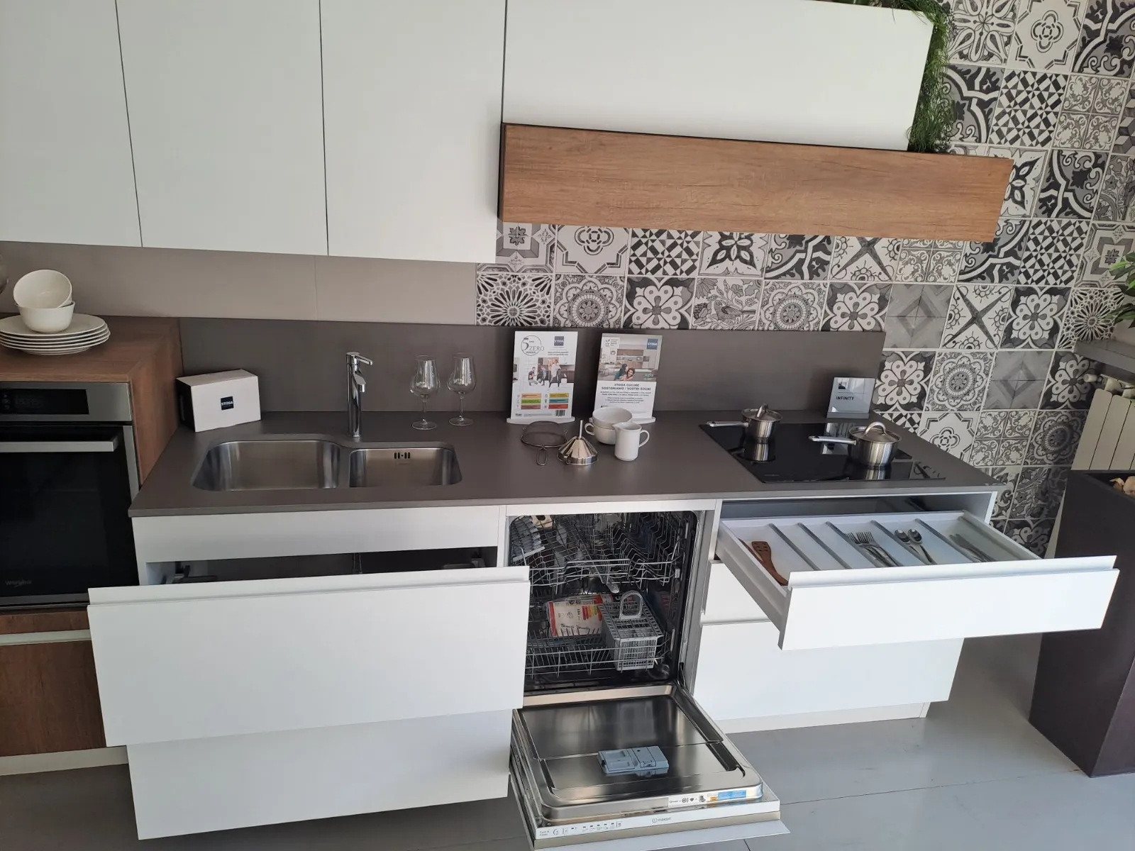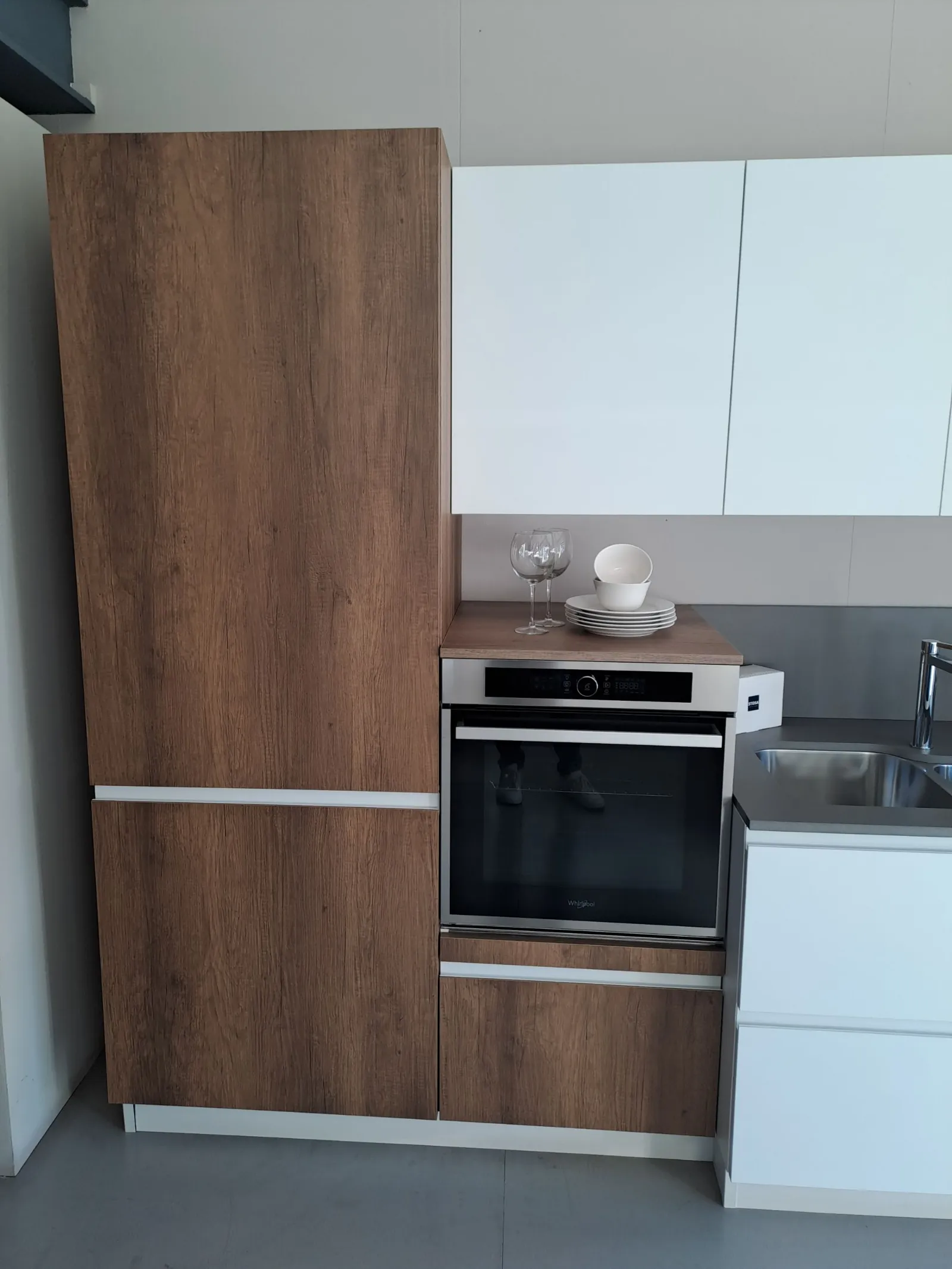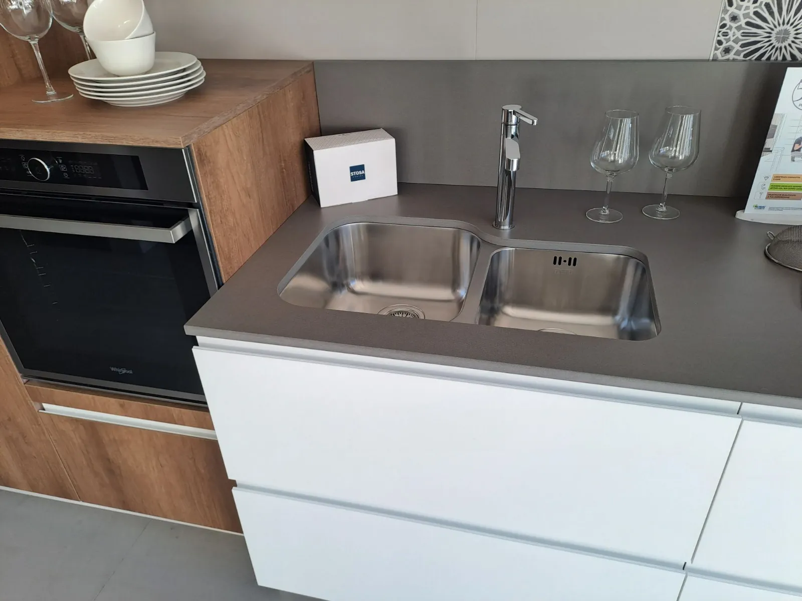 Cucina Stosa mod.Infinity in laminato bianco pet e rovere nodato, top in Gres ceramico Neolith sp 20mm prof. 75 con schienale h 30 cm in Gres come top, frigo da cm 75 di grande capienza, anta lavastoviglie con 2 settori .Dimensioni:cm 375 h 216 p 61/75, Costo € 14.245 scontata € 7.835 escluso trasporto e montaggio,compreso 5 anni di garanzia.