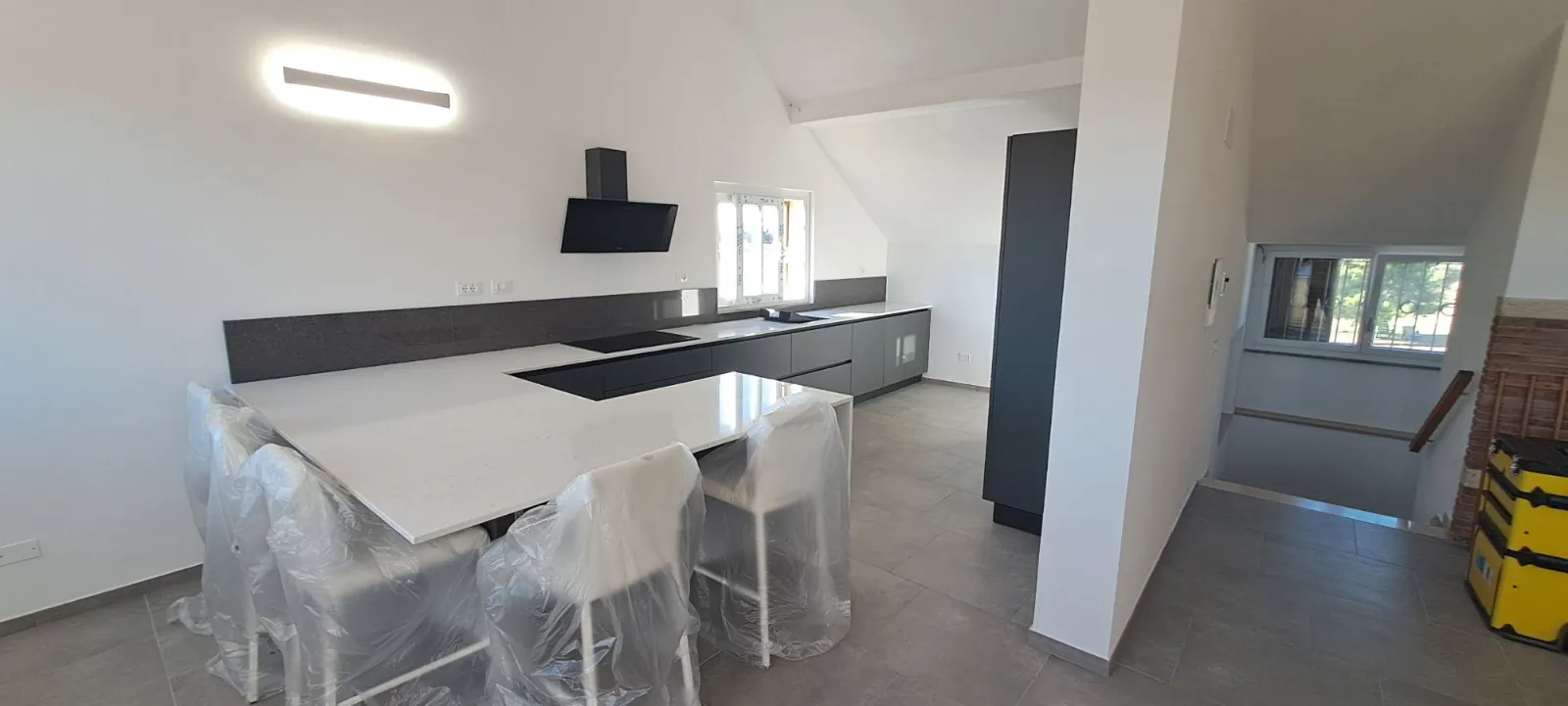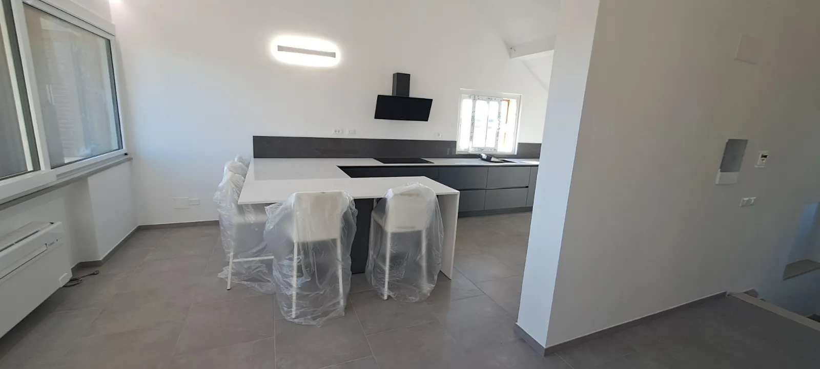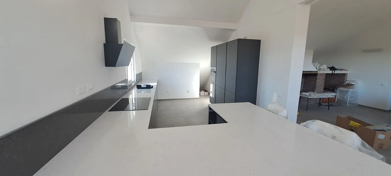 Cucina Stosa mod. Infinity grigio Grau, top e schienale in quarzo, piano cottura a induzione, apertura tramite gole.