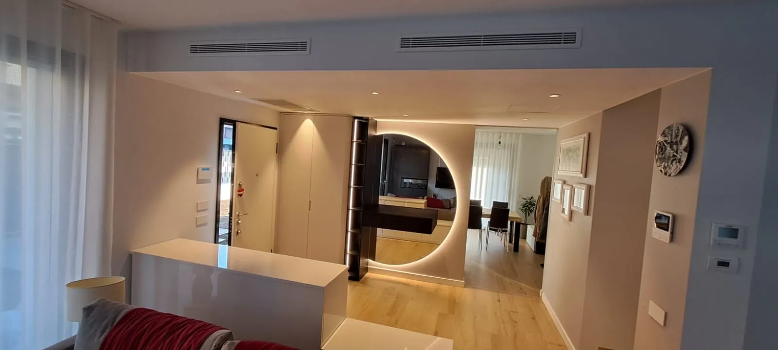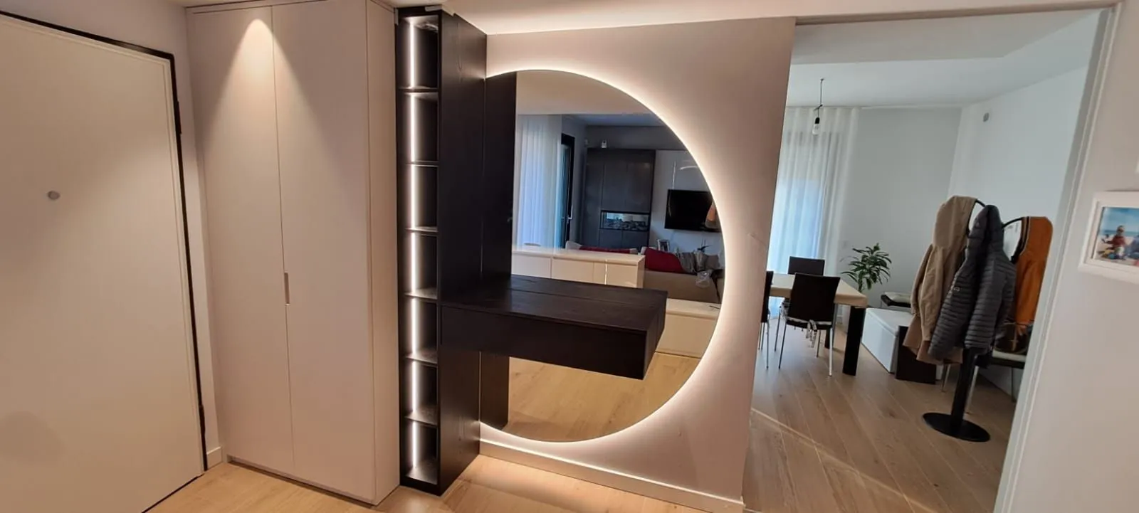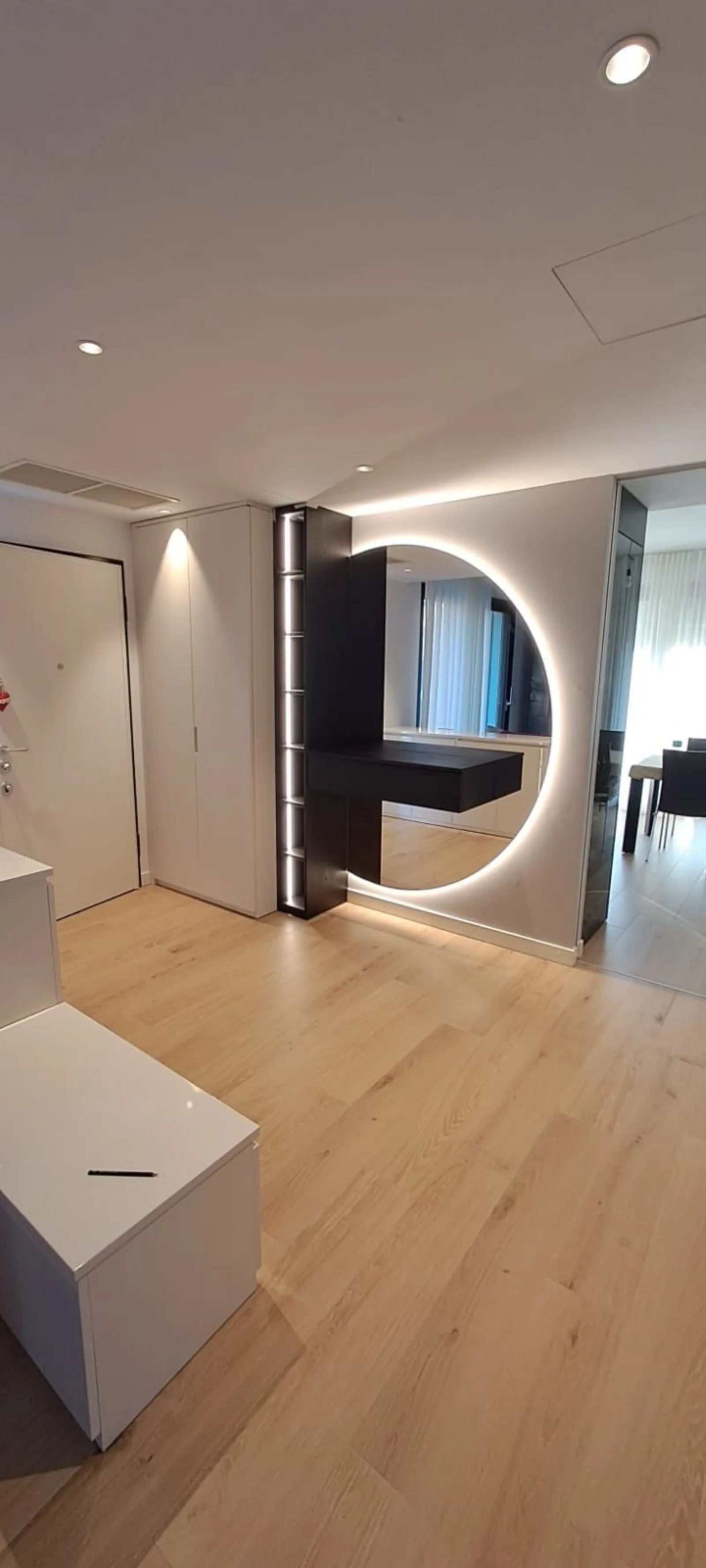 Ingresso realizzato artigianalmente, laccato bianco a poro aperto con parti in rovere scuro; armadio appendi abiti; specchio rotondo retroilluminato; led incassato nel vano a giorno; mobile divisorio laccato bianco lucido