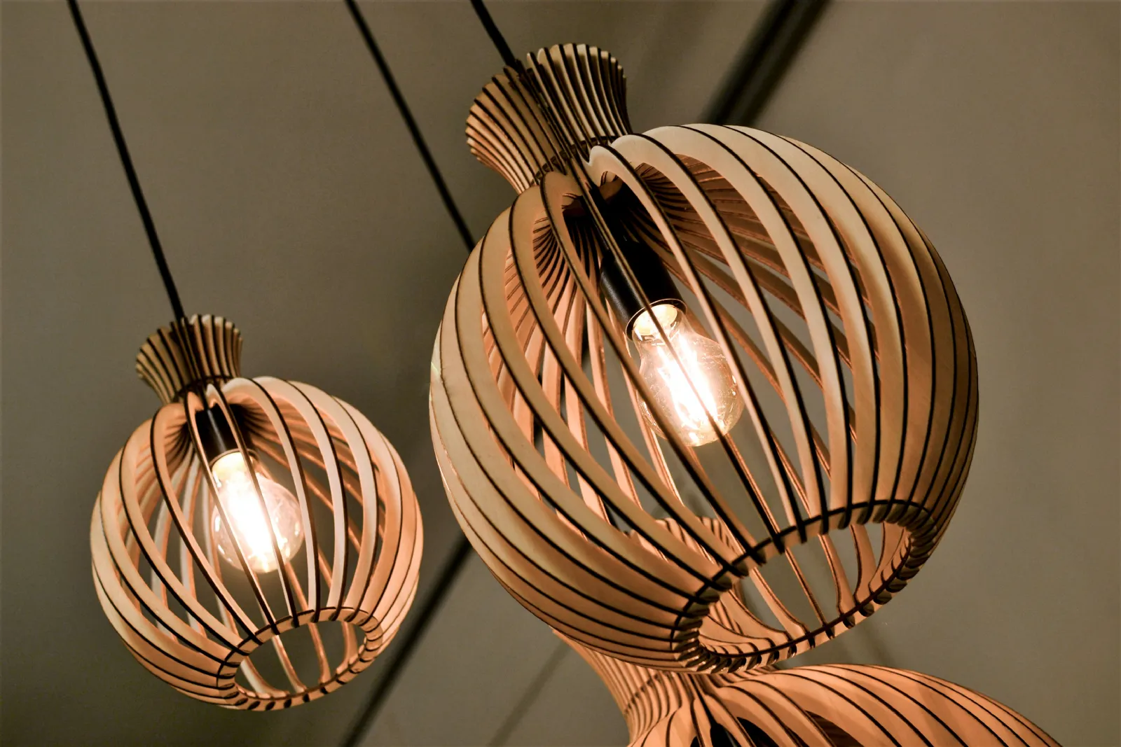 Lampade Mod. Laser artigianali ed ecologiche realizzate con pannelli in compensato di pioppo che grazie all'alternanza di pieni e vuoti creano atmosfere suggestive con bellissimi giochi di luce e ombre. Sono assemblate tramite incastri e colla vinilica, non verniciate e leggerissime con cavo in tessuto. Disponibili in tre diverse dimensioni con anche la possibilità di realizzarle su misura a richiesta. prezzo riferito a mod. Laser grande Ø 55 cm scontato