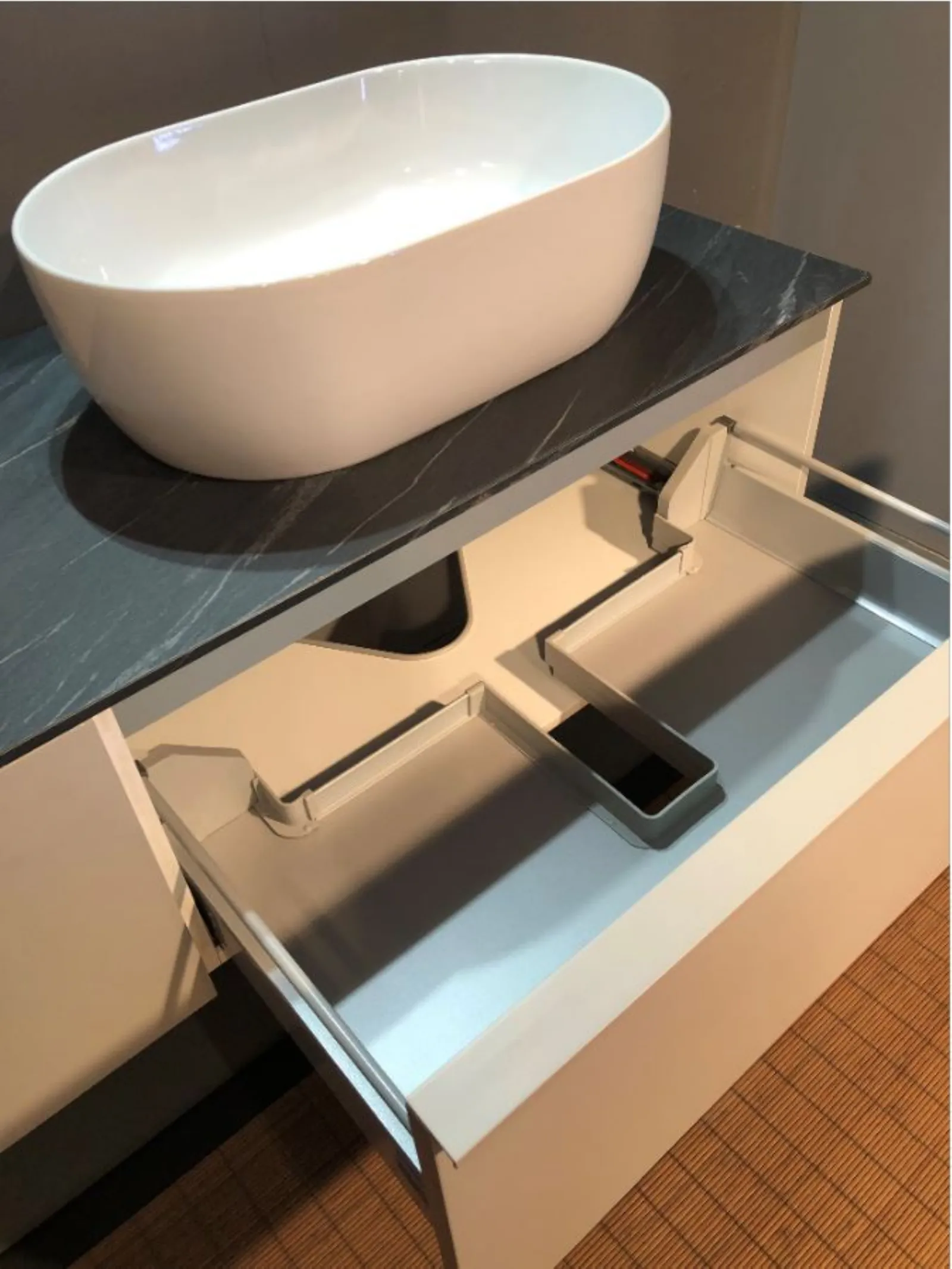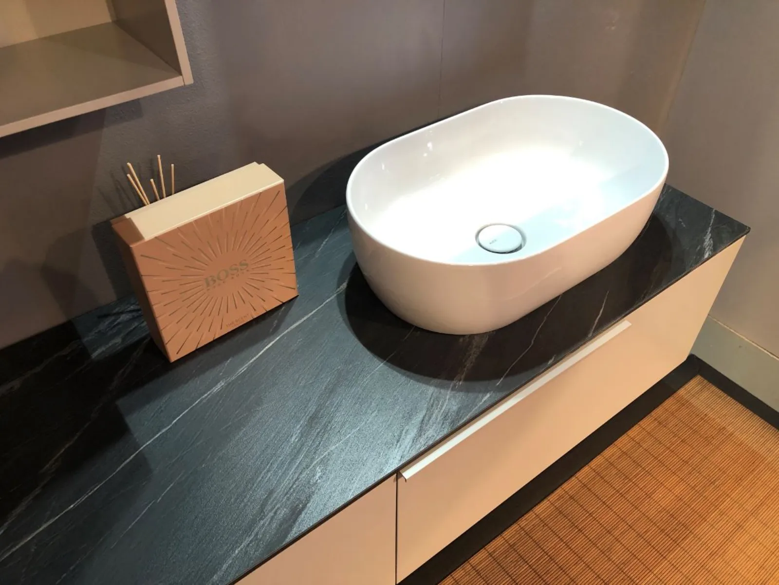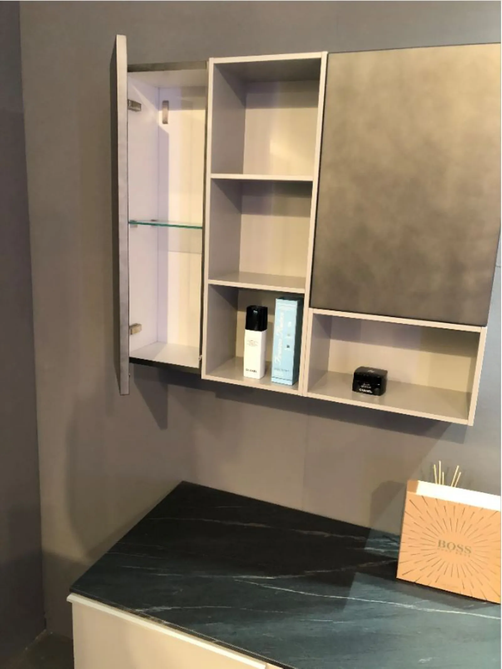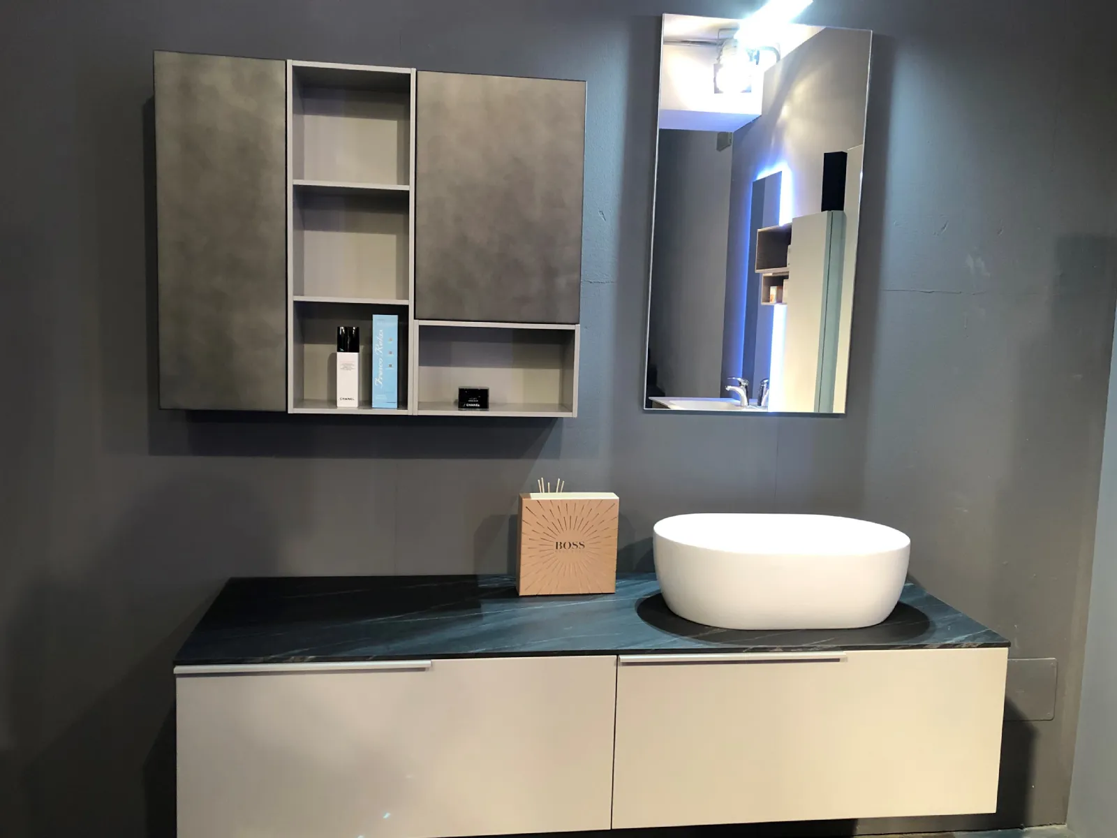 Composto da due basi da 80 cm con cassettone ,top in laminato HPL ardesia da 160 x 50 cm ,vasca in appoggio in ceramica ,specchio da 90 x 50 cm con lampada a led , conclude la composizione due pensili con anta e due vani a giorno.