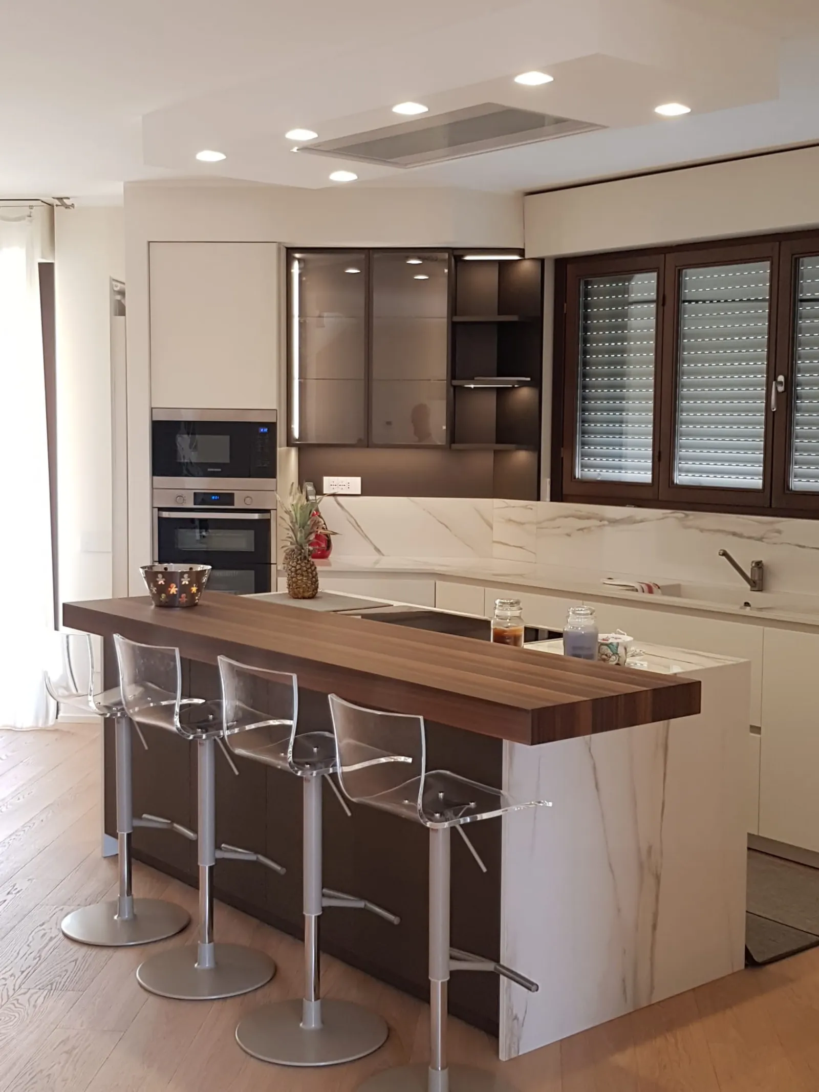 Cucina Stosa modello Infinity per openspace, composta da un piano in gress porcellanato Calacatta, stesso materiale usato anche per il piano del tavolo che crea continuità. Importante isola centrale dotata di piano cottura con cappa incassata nel controsoffitto definisce l'ambiente cucina. Colore dominante è il bianco per top e basi accostato al legno di eucalipto per vetrinette e piano snack sull'isola.